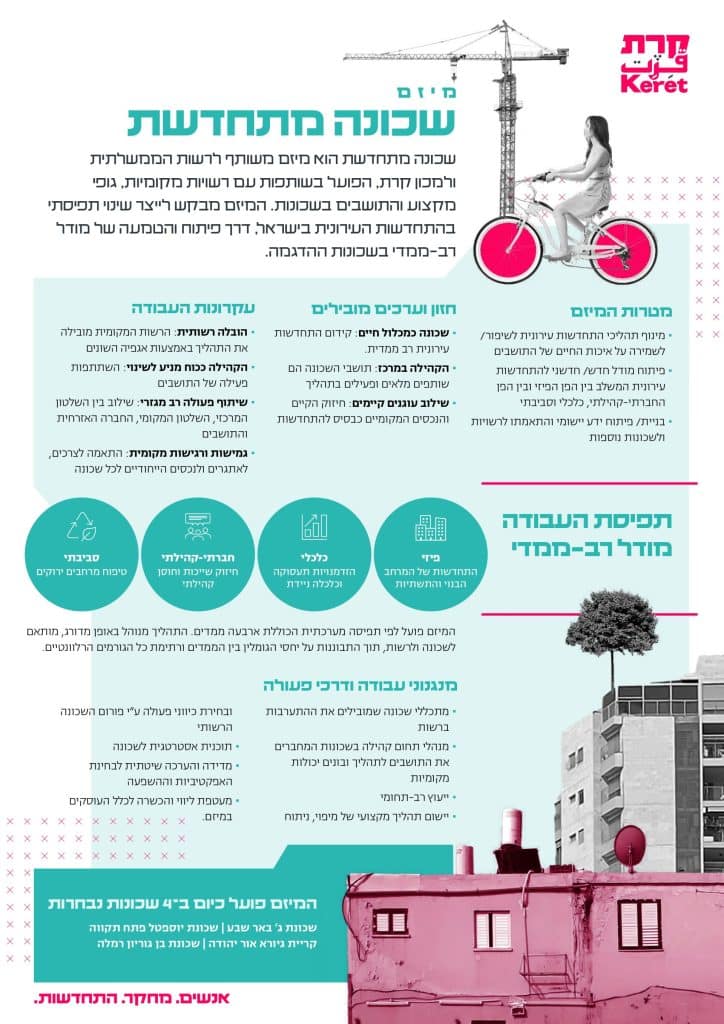 'שכונה מתחדשת' הוא מיזם משותף לרשות הממשלתית להתחדשות עירונית ולמכון קרת, הפועל בשותפות עם רשויות מקומיות, גופי מקצוע והתושבים בשכונות.